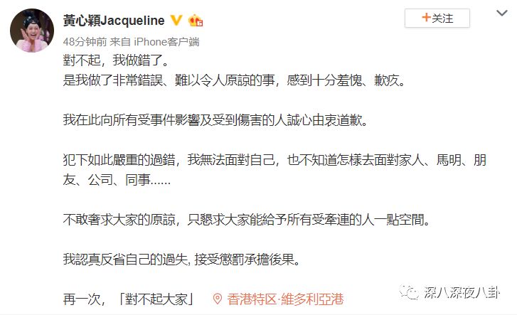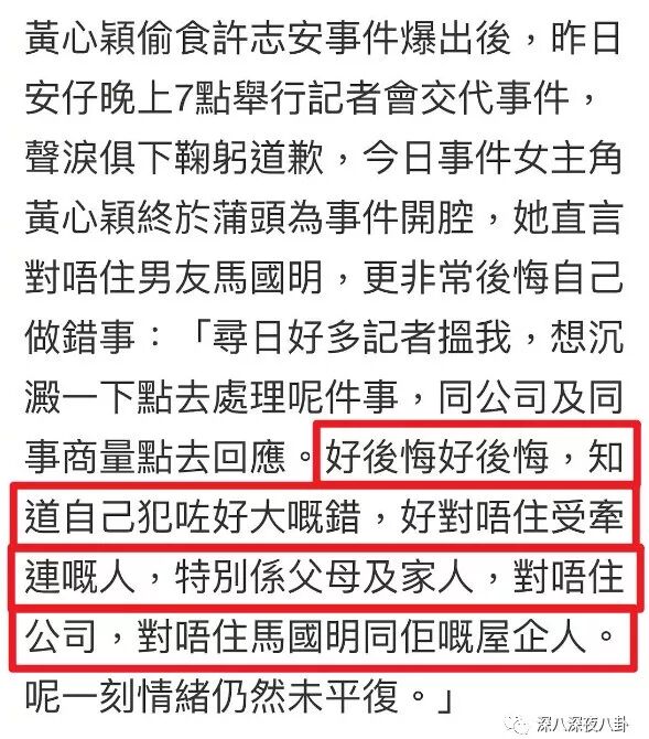 今天女主角也终于首度开腔,向家人、公司和男朋友马国明道歉