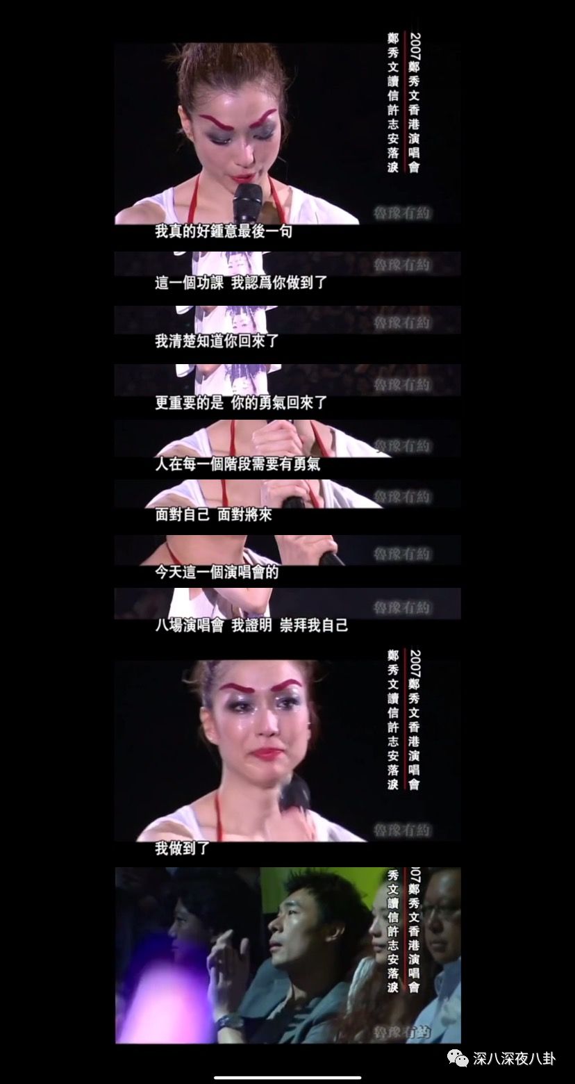 后来sammi想用“开一场巡演”来证明自己已经克服了恐惧,在尾场念了自己写的一封信。这回,换许志安在底下默默流泪……