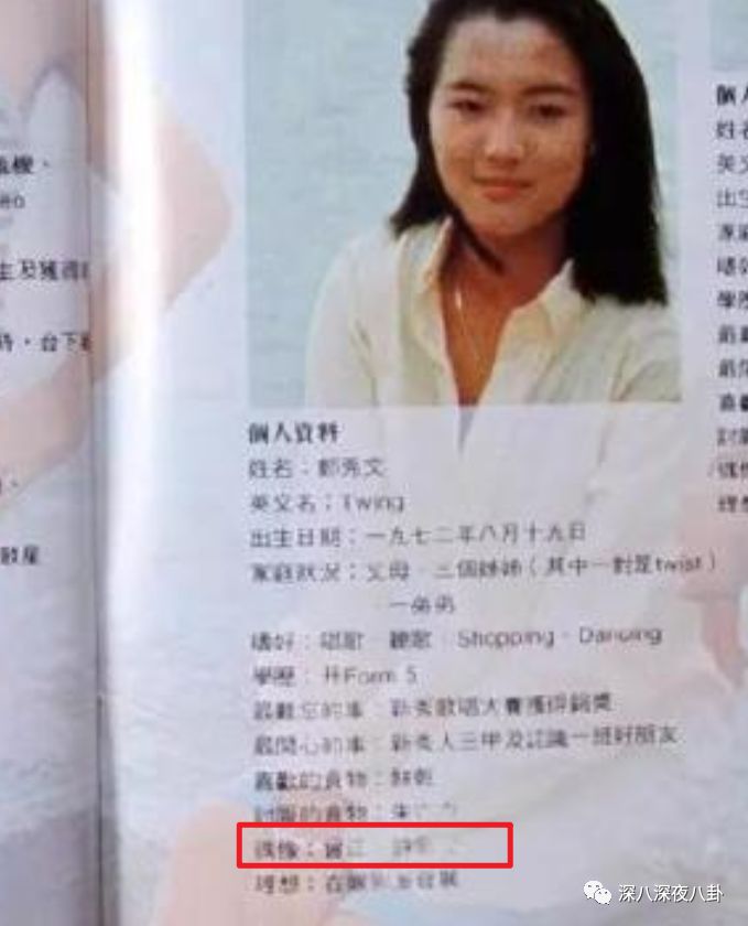出道前15、6岁的郑秀文,偶像那一栏就填着许志安↓