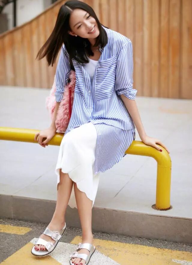 张梓琳身穿一件白色修身连衣裙搭配银色平底凉鞋清纯可人,外搭一件蓝色条纹衬衫充满青春气息。