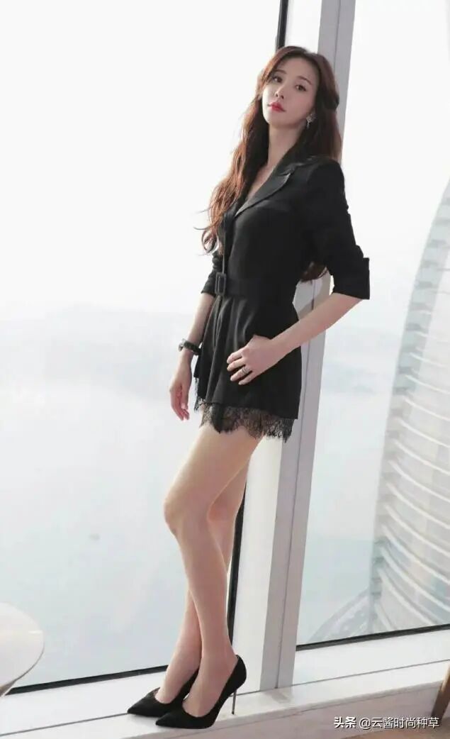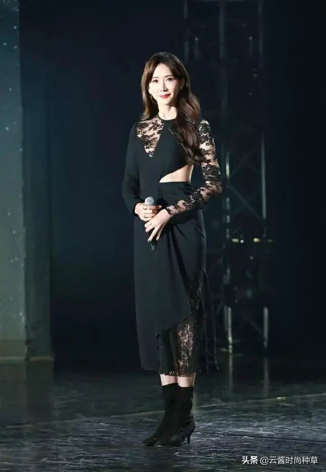 她也是很会突出自己的身材优势,这次选择了一件黑色和蕾丝拼接的修身裙,上半身的拼接在腰间还有不规则裁剪,这样的包臀连衣裙对身材要求还挺高的,要是有赘肉就穿不出来这样的性感了。脚上一双高跟短靴,再加上一头慵懒波浪卷,举手投足尽显魅力!