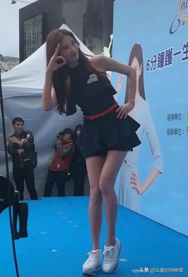 这条小黑短裙也是大同小异,无袖的她穿着也不会显肩宽,而且腰间的一条橘色系带超级吸睛,也增加了一些色彩感,下身伞状层叠裙的裙摆就算是胯大的仙女也能尝试。脚上的厚底小白鞋增加了海拔高度又时髦,小个子get起来啦!