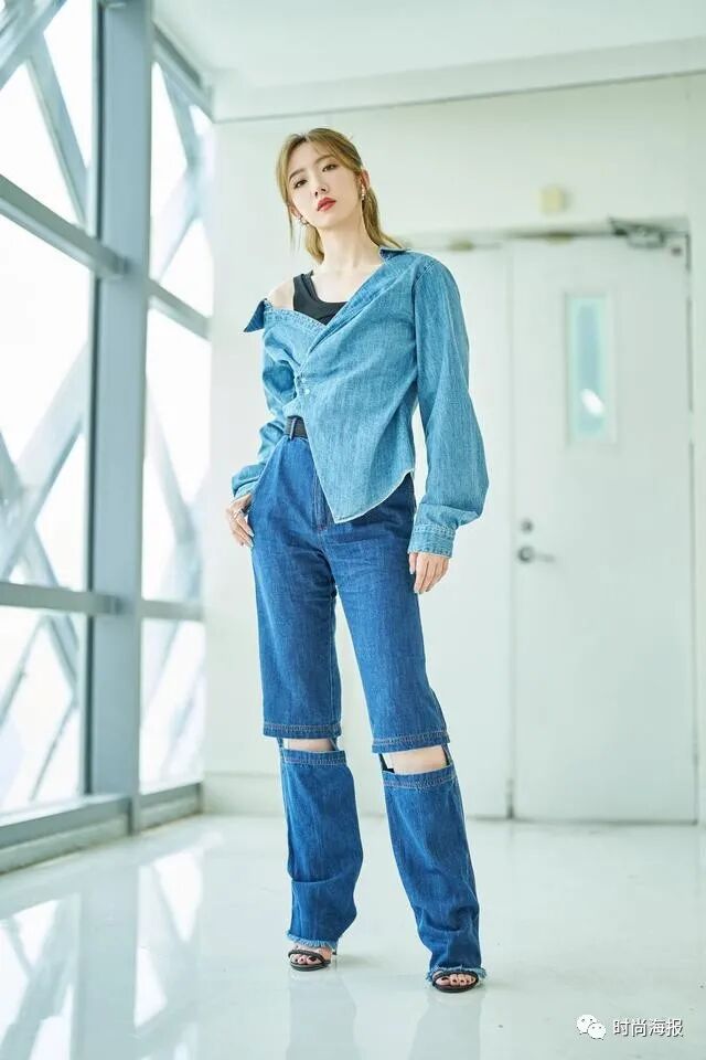 孟美岐就选择了高腰牛仔阔腿裤呈现时尚造型,短上衣配拖地裤尽显大长腿,更有破洞设计增添个性,让搭配变得减龄而独特。