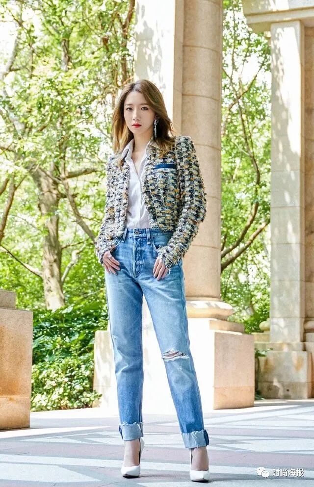 当然,普通的破洞裤也能塑造出无与伦比的减龄效果,结合不同风格的单品,同样展现出多样的时髦造型。孟美岐就选择了普通牛仔裤与垫肩外套的组合,让造型看起来青春而又不失格调,一双高跟鞋更增添了气场,使风格变得相当多变。