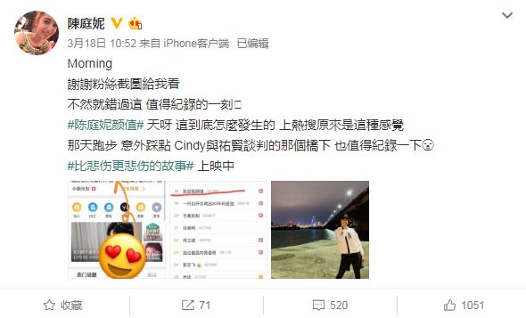 对于自己的颜值冲上了热搜,陈庭妮显得特别兴奋,还特意发了条微博庆祝这件事: