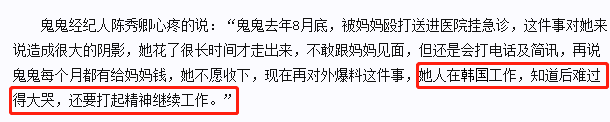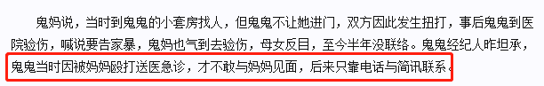 根据鬼鬼经纪人的爆料,母女俩还曾进行扭打,而鬼鬼更是被打到要送医院急诊,也因此害怕与妈妈见面。