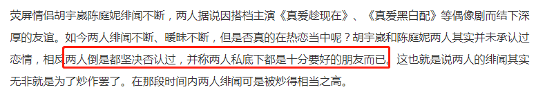 可对于这段绯闻,陈庭妮和胡宇崴始终保持着否定的态度,声称和对方不过是好友。