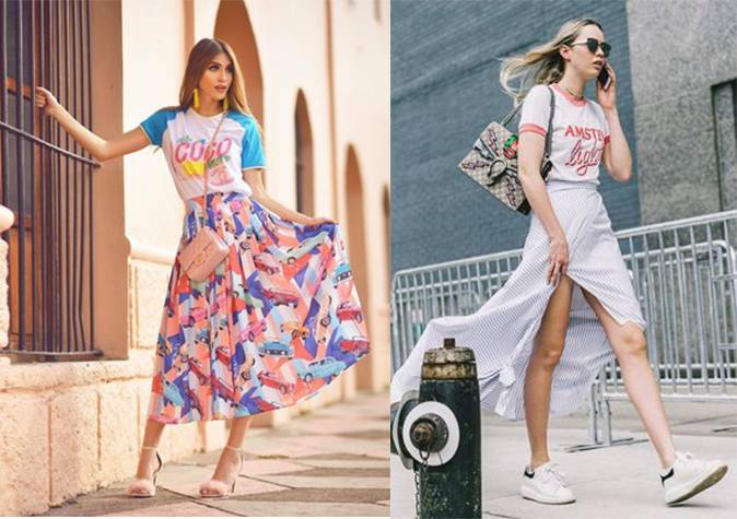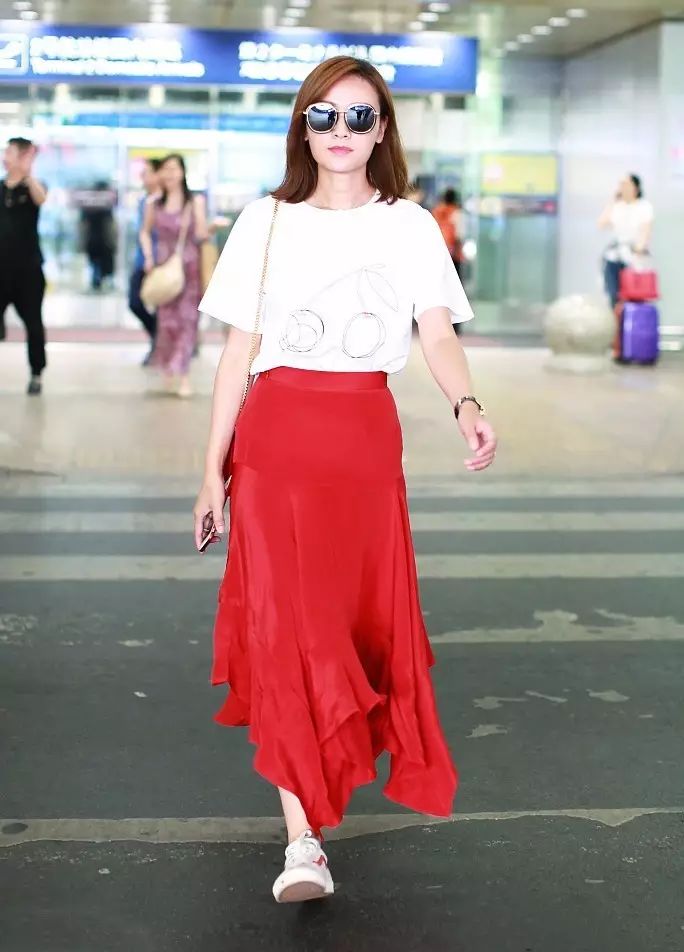 印花白Tee搭配不规则裙摆的红色长裙,时髦洋气的同时还超级衬肤色。