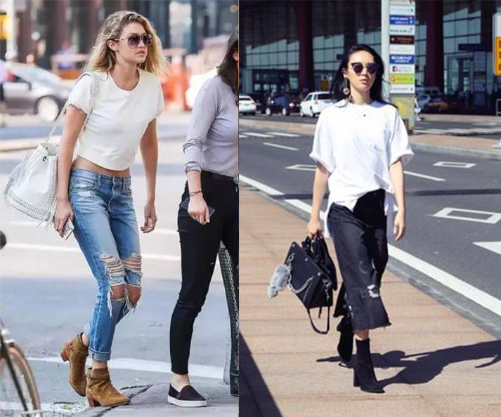 白Tee搭配破洞牛仔裤,脚踩一双高跟小短靴,街头时髦范就出来了~