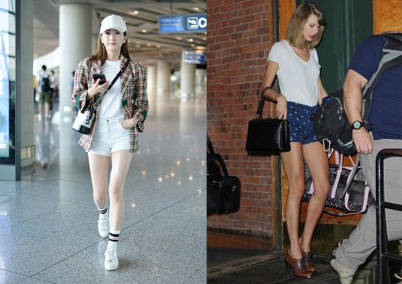 而霉霉这身搭配也同样出彩,白Tee加蓝色短裤,再配双棕色高跟鞋,细直的大长腿实力抢镜。