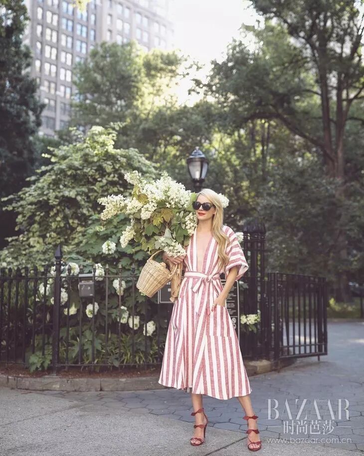 条纹与度假也是完美的一对搭子。随风飘扬的衣摆,再加上一个草编包、一双草编鞋,满满都是假日的悠闲~