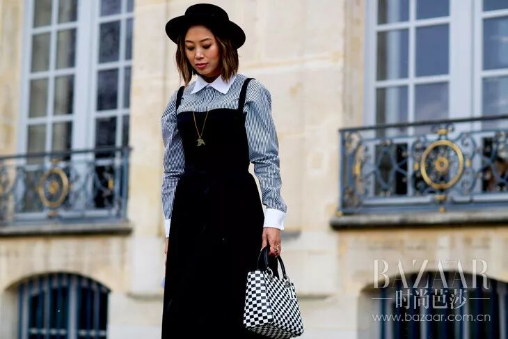 正式感十足的“桌布条”衬衫外穿一条紧身的吊带裙,正是刚柔并济的绝妙法则。不妨手中再拎一只“桌布格”包包,让撞色来得更猛烈些~