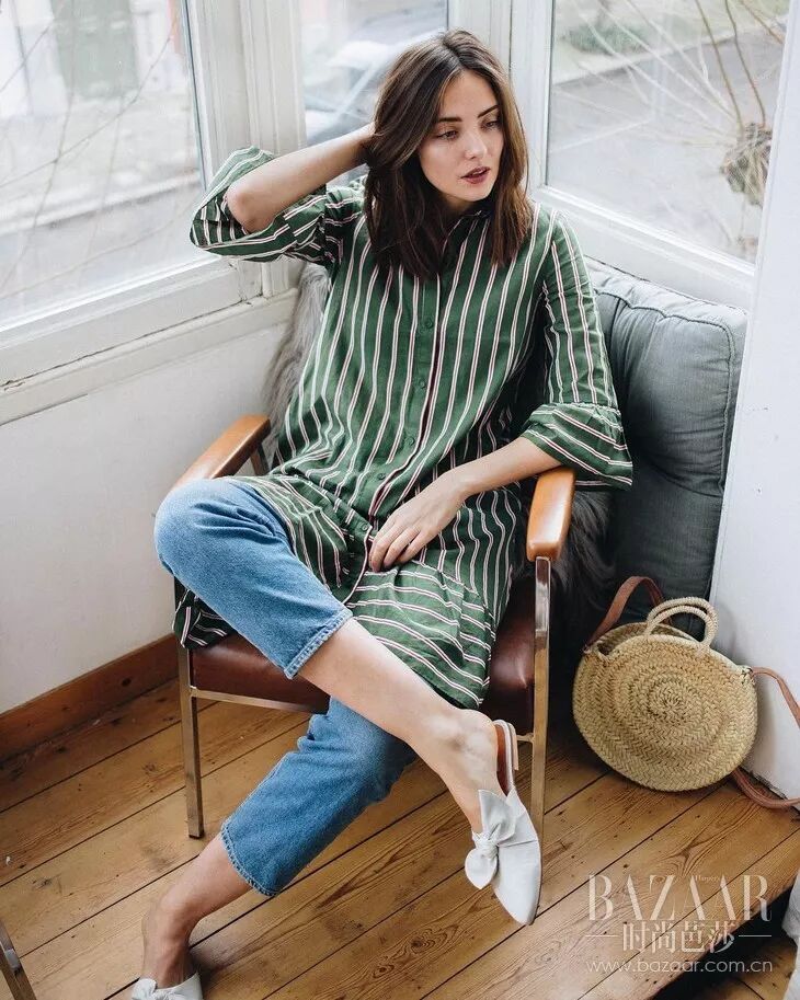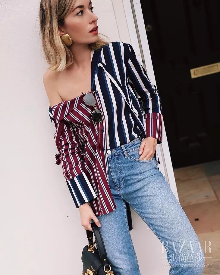 条纹长衫配牛仔,简直再适合通勤不过了。虽然人人都能驾驭,但是选择一条彩色条纹会更吸睛哦~