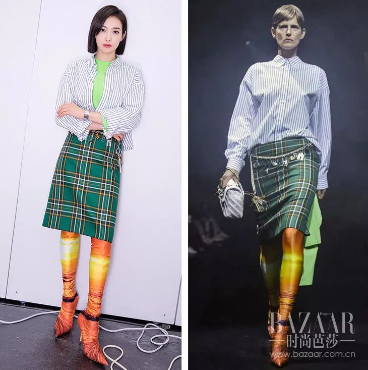 再看看越来越会穿的宋茜,原来她最近也这么干过!黑白条纹的“桌布”套在荧光色上衣的外面,连荧光都变高级了~