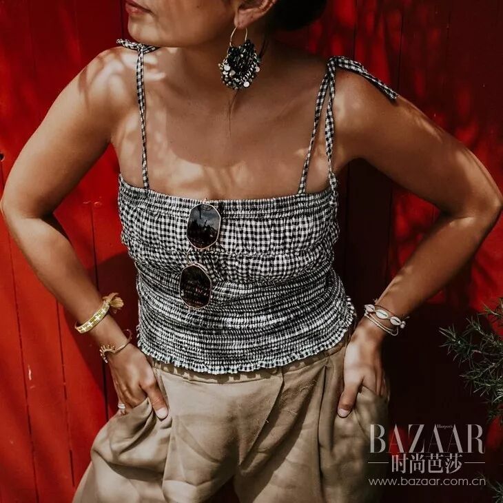 或者选用这种自带松紧的褶皱式小背心,在收紧腰部的同时,也通过格子面积的减少,让你显得更苗条~