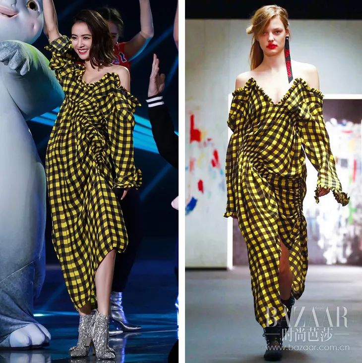 还有Jolin蔡依林,她也把黄黑格的“桌布”当成了连衣裙,真不是上台前随便在餐桌上扯的哦~