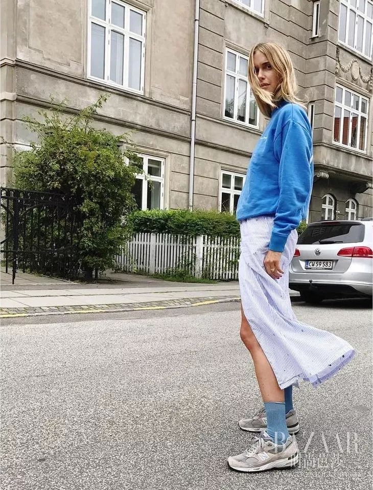 不冷不热的春天,用条纹半裙配一件卫衣正合适。再搭配同色系的袜子,仔细看才发现原来是“Head-to-Toe”的小心机~