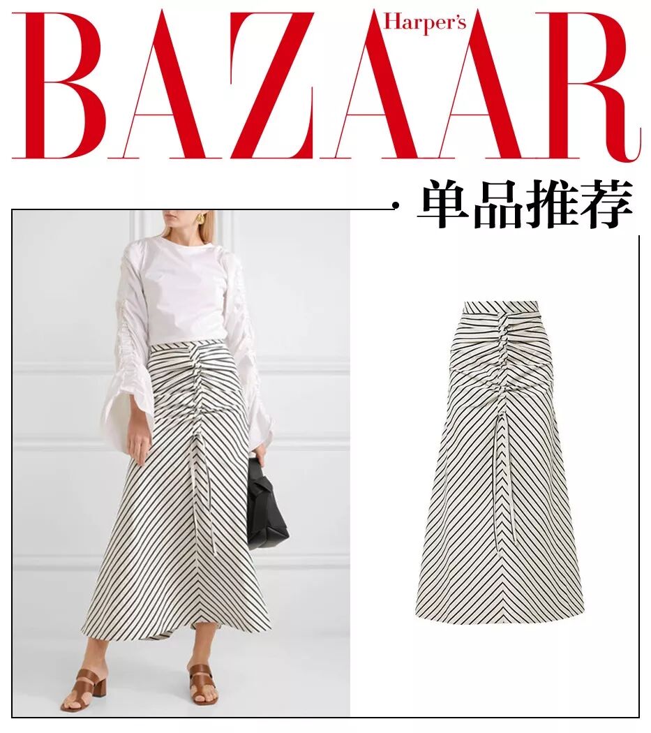 竖条纹能在视觉上拉长腿部,系带的设计又能帮助收紧腰部,搭配白衬衫,真是十分适合女强人的知性look!