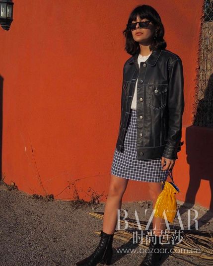 深色格子上衣容易显老显暗沉,搭配一条粉嫩色系的短裙,就能相得益彰,让你变成春天的Cool Girl~