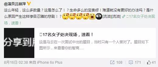 16日凌晨,孙海英的妻子、演员吕丽萍在微博上分享了一段名为《17名女子处决现场》的视频,感叹道:“这么年轻,这么多数量?这是怎么了!生命多么宝贵呀!难道就没有更好的办法吗?是什么原因产生这样惨不忍睹的悲剧!?”