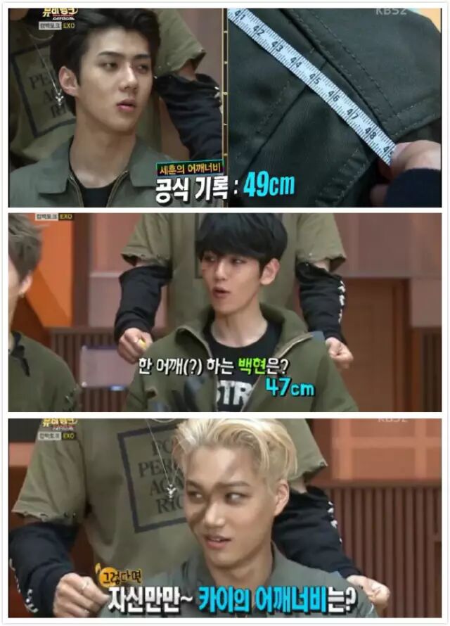 15日凌晨直播的KBS Music Video Bank Stardust节目中邀请了EXO任嘉宾,期间提及成员的肩宽,更即场量度,结果伯贤肩宽47cm,KAI有48cm,两位已属宽肩一族,没想到世勋竟有49cm,名副其实 「肩膀流氓」。