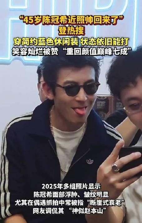 03 这些年,关于陈冠希的争议从未断过。有人说他已经“糊了”,有人说他“老了”,还有人说他“不如以前帅”。前阵子素颜直播,斑点、皱纹、胡子拉碴,全被镜头放大。有人调侃他像赵本山,也有人质疑他“颜值崩塌”。可陈冠希偏不在意。8月的北京,清晨的阳光下,他穿着自家潮牌,反戴棒球帽,双手插兜,站在桥头。拍照不用滤镜,出门不修边幅,连发型都懒得打理。有人追求精致,他偏要自在;有人只看表面,他更在乎内里。不是谁都敢在40多岁坦然素颜示人,也不是谁都能把谁能想到,45岁的陈冠希,穿着一身蓝色运动套装、利落短发加墨镜,现身北京街头,竟然还能炸出当年的“痞帅劲儿”?有人说他老了、有人说他糙了、还有人说他已经和潮流脱节了。可现实偏偏打脸——人群里最亮眼的,还是他。不是滤镜磨皮,不是刻意扮嫩,更不是装出来的自信,而是那股子“我就这样,你能咋地”的真实劲儿。这样的陈冠希,你敢说不服吗?