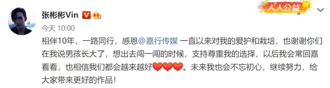 近日,演员张彬彬发文宣布与嘉行传媒合约到期不再续约。不久后,嘉行传媒也评论该条内容祝其未来顺利,正式宣告双方和平分手。