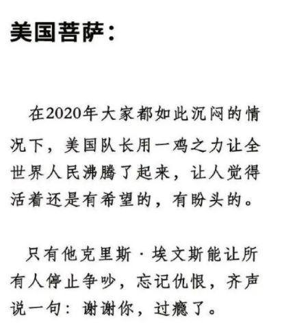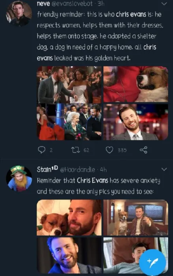 问题来了:"美队" Chris Evans 是怎么回应私照曝光的? 鸽草记 欧美男星 2020-09-15 17:00:35 21 创作不易,用心坚持,欢迎请BaGua喝几杯爱心咖啡!打赏并支持本文 打赏并删除本文 这两天,"美队" Chris Evans 凭着一己 (?) 之力点燃整个社交网络,突如其来的艳照让大家沉闷的日子不再无聊乏味?。据说是 "美队" Chris Evans 在 Instagram 上用短视频分享一些日常,然后不小心扫到自己的手机相册,导致自己的??照曝光。虽然照片被发出后第一时间就被他删除了了,但这件事还是引爆了全球互联网。平时给大家的感觉,美队可能是肌肉结实,一脸正气的酷男孩。然而,当大家刷到 Chris Evans 的 Ins Story 时的反应? 不是很顺的2020年,美队毅然决然选择了挺身而出,凭借着“一鸡之力”让大家兴奋起来。各种梗+表情包就来了。漫威成员集体震惊为此,绿巨人马克叔Mark Ruffalo发推安慰:“兄弟,只要川普还在当总统的一天,就没有什么事儿好让你觉得尴尬的....”脑洞大开的网友们开始自发制作表情图“当我看到美队的迪克之后:”“美队刚刚从我家破门而出了:”“当我了解了美队的名字为何登上热搜时:”“这是美队在路上摔倒的样子:”“美队泄露了自己的果照后,所有的女人都倾巢出动抢着去看:”美队因为被称之为“美国菩萨”当事人终于在今天回应了,他没有找任何理由:比如盗号啊、手滑啊、助理所为啊。没有!而是风趣地表示:“既然你们现在都注意到我了,那11月3号记得给大选投票哟。”不过美队本人很早就患上了焦虑症。网友们调侃归调侃,很快就开始呼吁停止和抵制继续传播美队下体的照片和话题了。希望下一次不管又是谁的私照曝光,大家也能本着对chris evans的态度,少一点对阿娇、张柏芝、詹妮弗劳伦斯那样的伤害。要是能长按二维码关注就更好了独乐乐不如众乐乐你倒是点“在看”啊 创作不易,用心坚持,欢迎请BaGua喝几杯爱心咖啡!打赏并支持本文 打赏并删除本文 感谢您的支持鼓励,我会继续努力的!文章地址:用户邮箱:打赏金额:USDT 请输入数字点击”去打赏“,即可进行打赏支持本文章哦 Chris Evans 发表评论