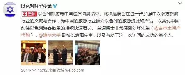 最绝的是有一次,刘烨把微博名字改成了“吉林土特产代购”,正好他当时在参加以色列驻华大使馆的活动,然后就出现了下面这一条微博↓