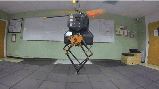 所以,在此基础上波士顿动力研发出了上图这款叫ATRIAS的机器人。它在两条腿上面的盒子中加上了驱动,而腿部放置了弹簧(用以储能),在行走的过程中腿以以一种被动摆动的形式交互运作。ATRIAS引入了弹簧-质点模型(身体的质量以一个单点的形式附着在一条“无质量”的弹簧腿上)。腿上的弹簧可以在每只脚落地时储存部分能量,并把它转变成推动机器人下一步的力量,正如动物腿上的弹性关节。