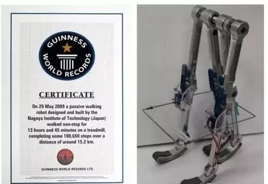 上图这个机器人可不简单,它是世界纪录的保持者,目前最新的纪录是连续步行27小时,总长72公里(相当于十万步还要多)。而最最关键的是,它完全凭借自己完美的机械结构,没有任何动力源。对!没有电机、没有电源,给它一个初始动力就在那干走27个小时。它的发明者是日本名古屋工业大学佐野明人教授。