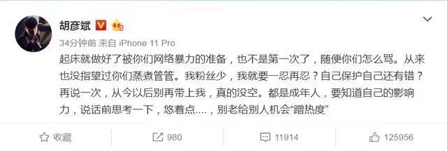 而这一次,胡彦斌是铁了心要和郑爽划清界限。看看他说了点啥吧。