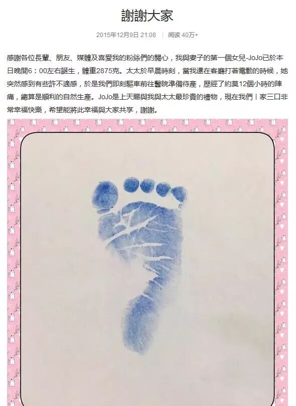 12月9日晚, 欧弟通过其经纪人向腾讯娱乐发来当爸感言:“感谢各位长辈、朋友、媒体及喜爱我的粉丝们的关心,我与妻子的第一个女儿JoJo已于本日晚间6:00左右诞生,体重2875克。太太于早晨时刻,当我还在客厅打着电动的时候,她突然感到有些许不适感,于是我们即刻驱车前往医院准备待产,历经了约12个小时的阵痛,总算是顺利的自然生产。JoJo是上天赐与我与太太最珍贵的礼物,现在我们一家三口非常幸福快乐,希望能将此幸福与大家共享,谢谢。”网友在得知喜讯后纷纷祝贺,“恭喜欧弟喜获小公举!”、“祝贺!欧弟当爸爸了!”
