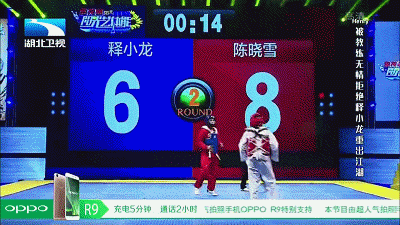 释小龙利用一记后摆(4分)再将比分反超!6:3!不过对手也有点被踢懵了,释小龙也利用读秒间隙表达了歉意。中场前,陈晓雪又追回1分,比分战成6:4,释小龙暂时领先。
