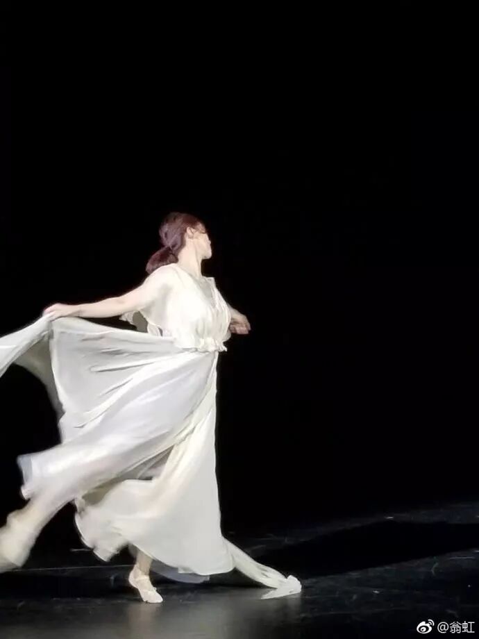 照片中,舞蹈出身、已经五十岁的翁虹身穿白色舞蹈裙,在母校的舞台上大秀舞技。虽然看不清脸,但身材依然火辣。