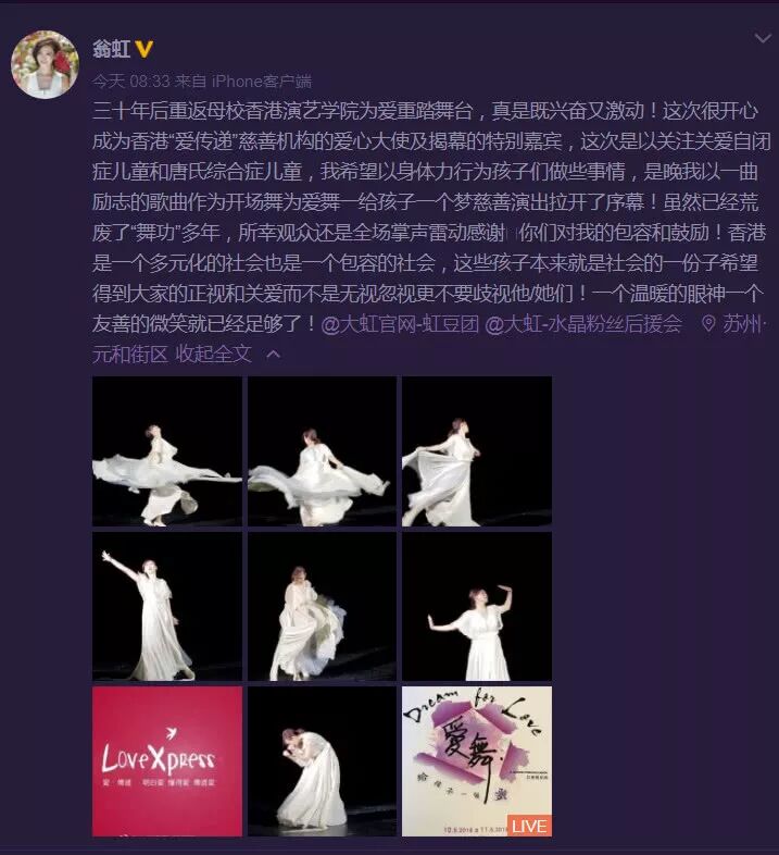 今天早上,翁虹发微博晒出三十年后重登母校舞台的照片,还配文:“三十年后重返母校香港演艺学院为爱重踏舞台,真是既兴奋又激动!这次很开心成为香港“爱传递”慈善机构的爱心大使及揭幕的特别嘉宾,这次是以关注关爱自闭症儿童和唐氏综合症儿童,我希望以身体力行为孩子们做些事情,是晚我以一曲励志的歌曲作为开场舞为爱舞一给孩子一个梦慈善演出拉开了序幕!虽然已经荒废了“舞功”多年,所幸观众还是全场掌声雷动感谢你们对我的包容和鼓励!香港是一个多元化的社会也是一个包容的社会,这些孩子本来就是社会的一份子希望得到大家的正视和关爱而不是无视忽视更不要歧视他/她们!一个温暖的眼神一个友善的微笑就已经足够了!”