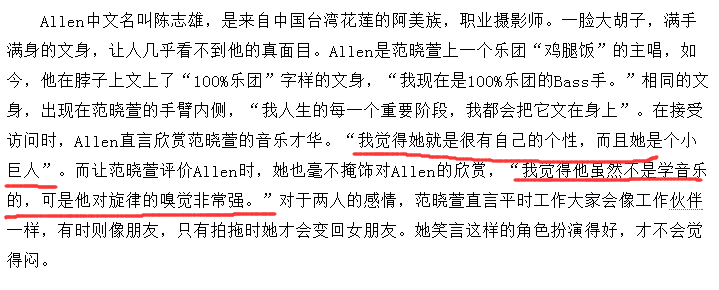 恋爱对象是乐队的bass手,媒体对这段关系一点都不看好,还说男生穷,要范晓萱倒贴钱之类的。
