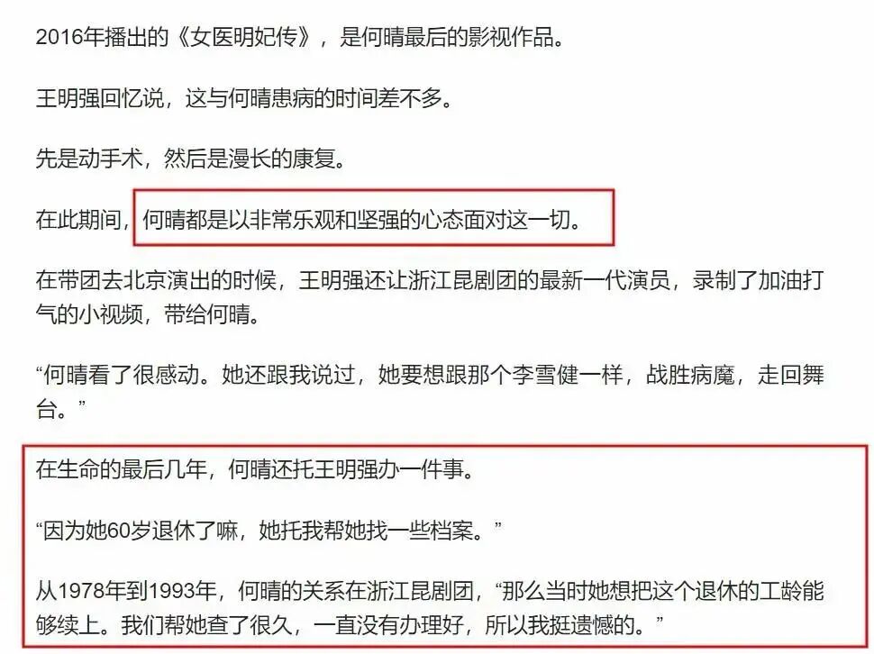 据昆剧团原团长,兼好友的王明强透露,何晴仍有一颗恢复健康、回归荧幕的心,像李雪健一样打赢这场“仗”。
