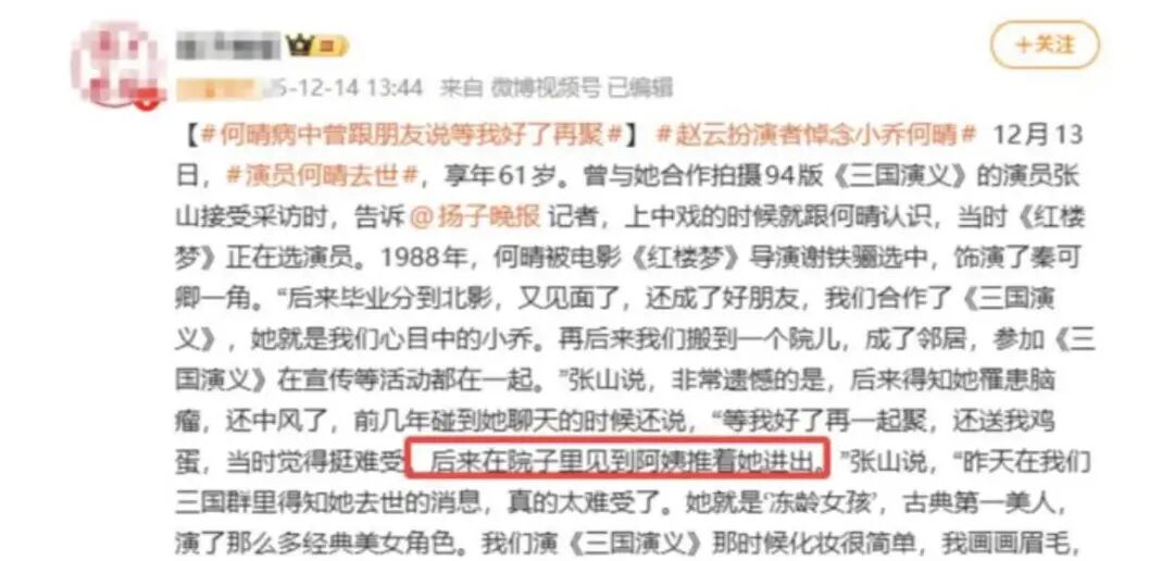 何晴说话开始不利索,语速缓慢、词不达意,甚至还经历中风,出现行动不便,腿脚“下岗”,只能由雇佣的保姆阿姨推着进出。