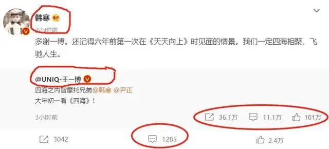 1月30日,王一博发文帮忙宣传韩寒的新电影《四海》,两个小时收获评论11万多条、转发36万、点赞高达161万,论宣传效果,远超一场大型新闻发布会。