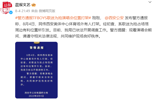 8月4日晚上,TFBOYS的粉丝因为抢占场馆周边的位置发声肢体冲突,演唱会还未开始,打架先行。这也让众多粉丝集体高呼道歉,极力让这出风波停息。