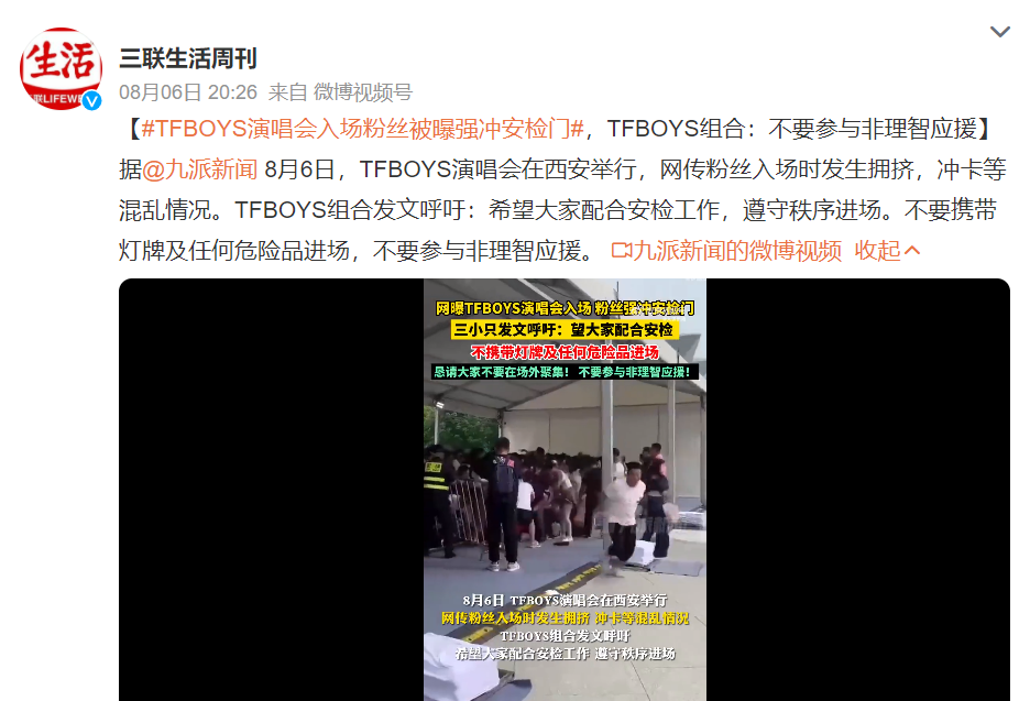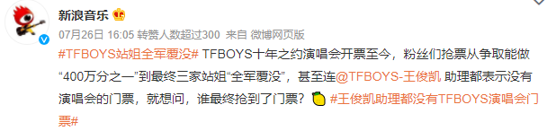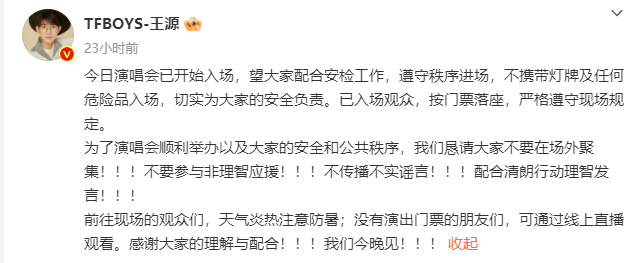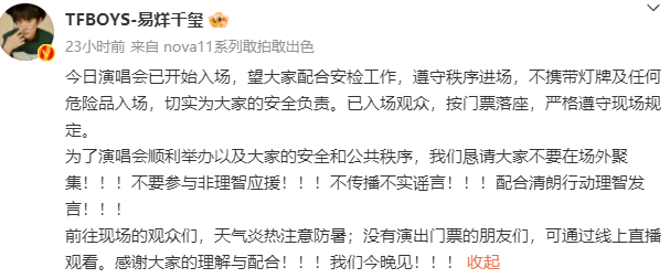 TFBOYS的社交平台上也只表示演出结束,希望粉丝们有序彻底。