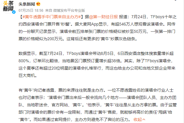 因为难抢,TFBOYS十年之约演唱会的黄牛、代抢等各种衍生也成了新闻话题,一张门票可以涨价20倍仍然难求,超过6位数、甚至超过7位数的前排门票也让人错愕,虽然这个价格存在“水分”,但是两到三万元一张的门票则是的的确确存在。