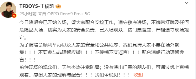 这让王俊凯、王源和易烊千玺齐齐发声,呼吁粉丝们按秩序入场和落座,不要带灯牌等物品入场。为了呼吁粉丝冷却过度热情,艺人除开排练,也很劳心。