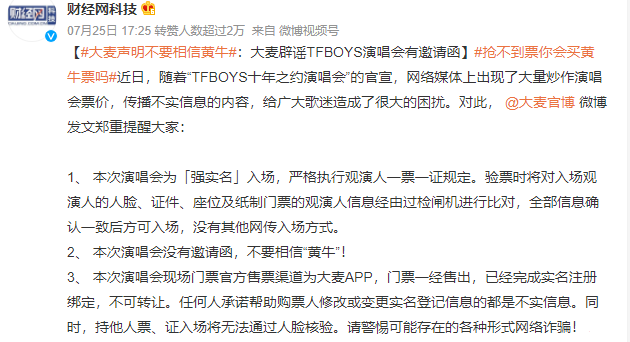主办方和票房也一再升级实名购票不可转让、刷脸购票等规则,依然并未缓解门票基本抢不到的局面。同时还滋生了“邀请函”之类的骗局,这让主办方连夜开始发声呼吁粉丝不要被骗。