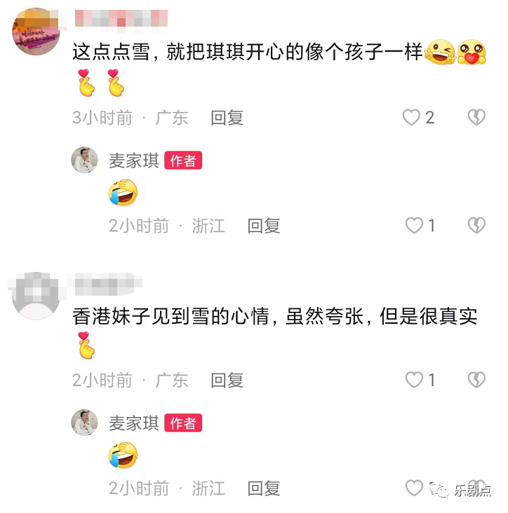 网友们看了麦家琪,纷纷留言调侃她。有人写道,这一点点雪,就把你开心得像个孩子一样。有人写道,你看到雪的表现虽然夸张,但也很真实。还有人提醒她别那么激动,小心扭到腰。