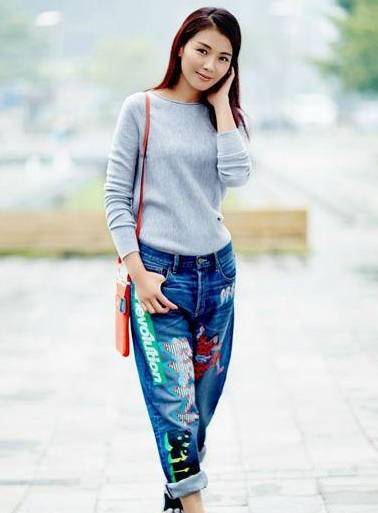 灰色针织衫配印花牛仔裤,十分的修身,加上牛仔裤上的卡通图案显得十分的有个性,看上去很青春。
