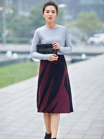 刘涛这一身灰色针织衫配拼接色的长裙,显得十分利落和精神,加上酒红色长裙很优雅迷人。
