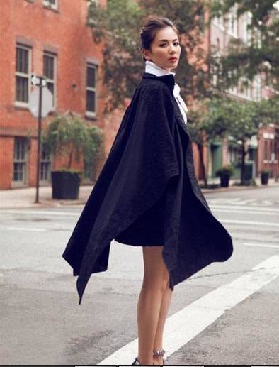 黑色的斗篷大衣加上连衣裙看上去十分美丽,很好的秀出刘涛的美腿,加上同款黑色高跟鞋鞋带钻的点缀显得优雅大方。