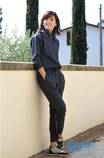 这一身深蓝色连体裤配运动鞋 ,被刘涛穿起来看着很潇洒帅气。